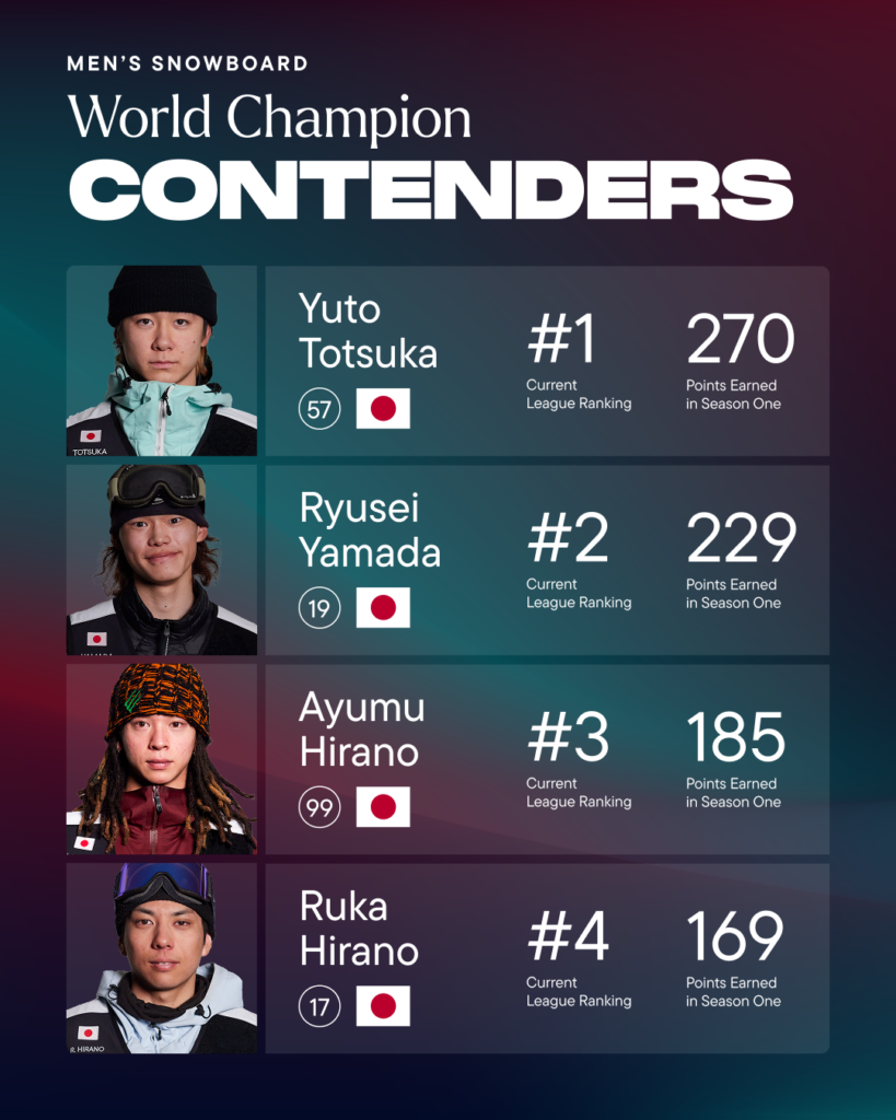 Japan’s Totsuka—the newly minted Olympic gold medalist—leads the current standings with 270 points and holds the clearest route to the title, though not without a challenge. With one event remaining, Totsuka needs a fourth-place finish or better in LAAX to secure the inaugural Snow League championship, regardless of how the rest of the field performs.