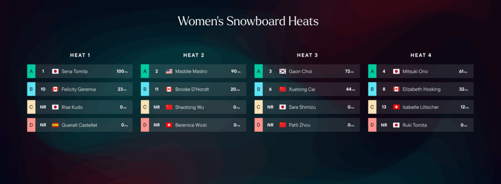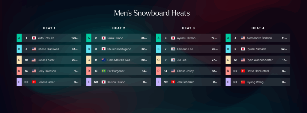 The Qualifying Day format saw athletes grouped in heats, battling to advance across two runs with the top scorer advancing automatically to Finals Day. The lowest scoring athletes were eliminated, and the remaining field was then given a second chance to advance in the Last Chance Qualifier.